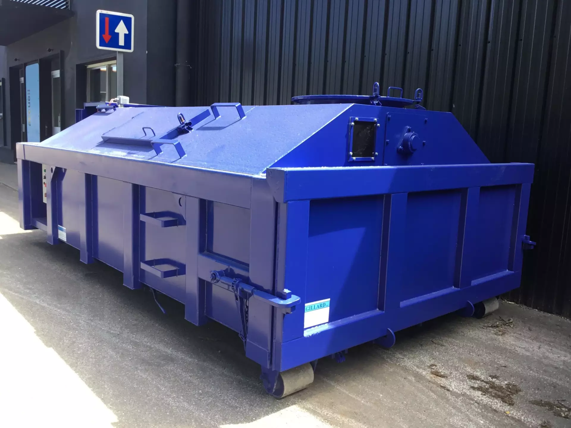 Fabriquée en acier S235 renforcé, la benne à vis GILLARD est disponible en volumes de 8 à 15 m³. Son fond incliné optimise l’écoulement naturel des matières fines et humides. Par ailleurs, la tôle épaisse garantit une excellente résistance à l’usure et aux sollicitations mécaniques. Le toit peut être fixe ou relevable selon vos contraintes d’utilisation.