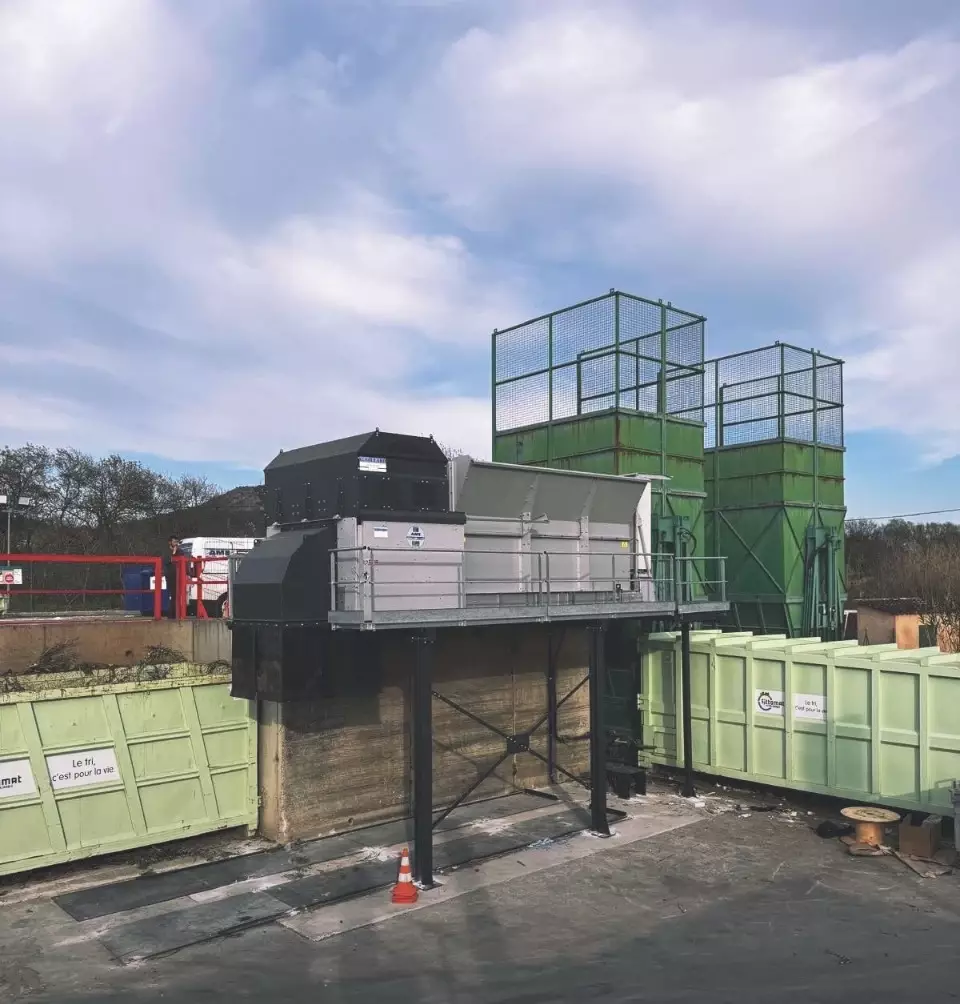 Version à quai : un bâti métallique place le broyeur au-dessus de la benne de récupération. Dès lors, les broyats tombent directement dans la benne.
