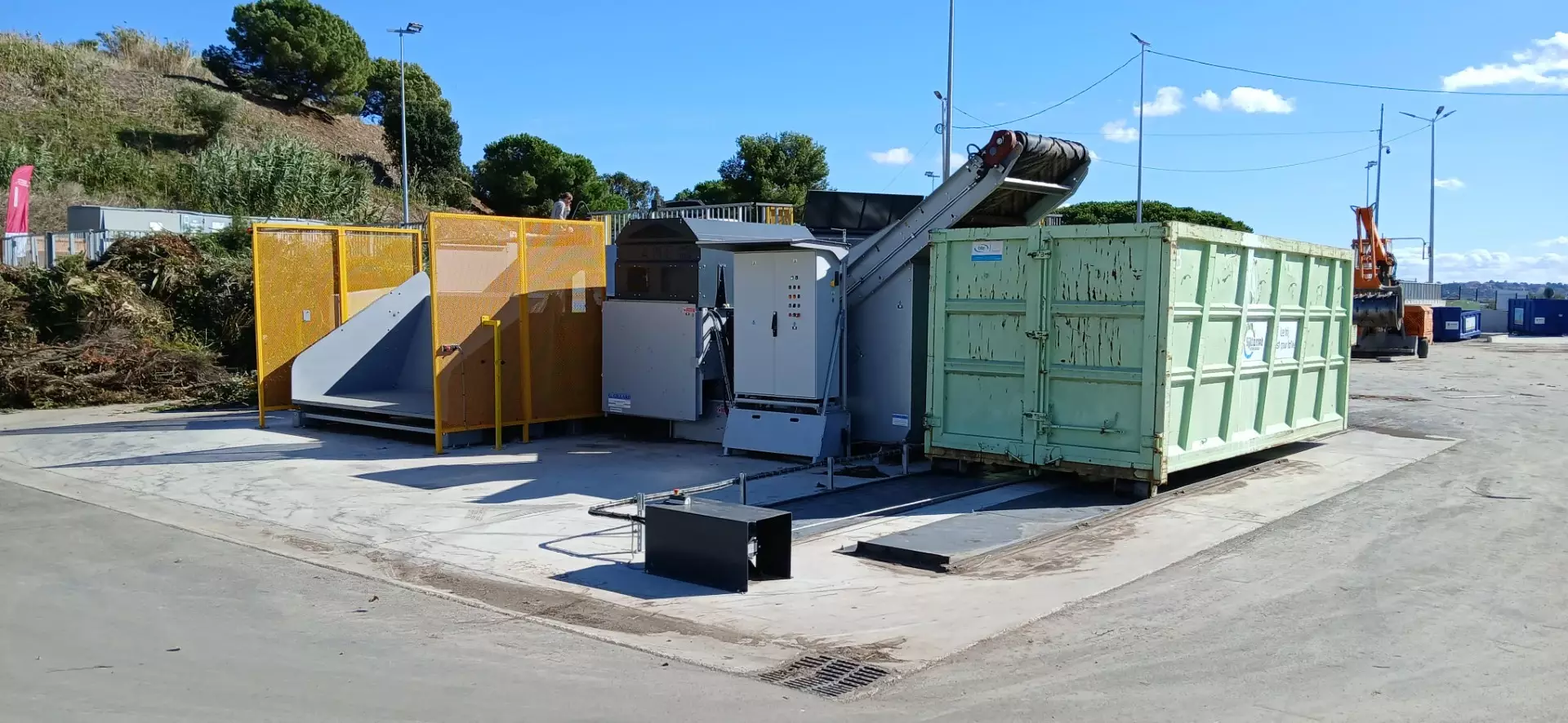 En outre, la machine limite son niveau sonore à 85 dB, ce qui réduit les nuisances pour les usagers et le voisinage. Enfin, sa trémie de 4,5 m³ stocke temporairement les déchets avant broyage, tandis que le godet de 4 m³ sert à la phase de chargement ou fait office de zone tampon lorsque la benne est pleine.